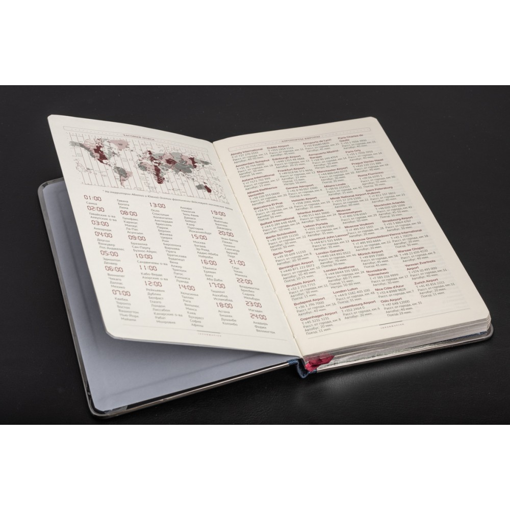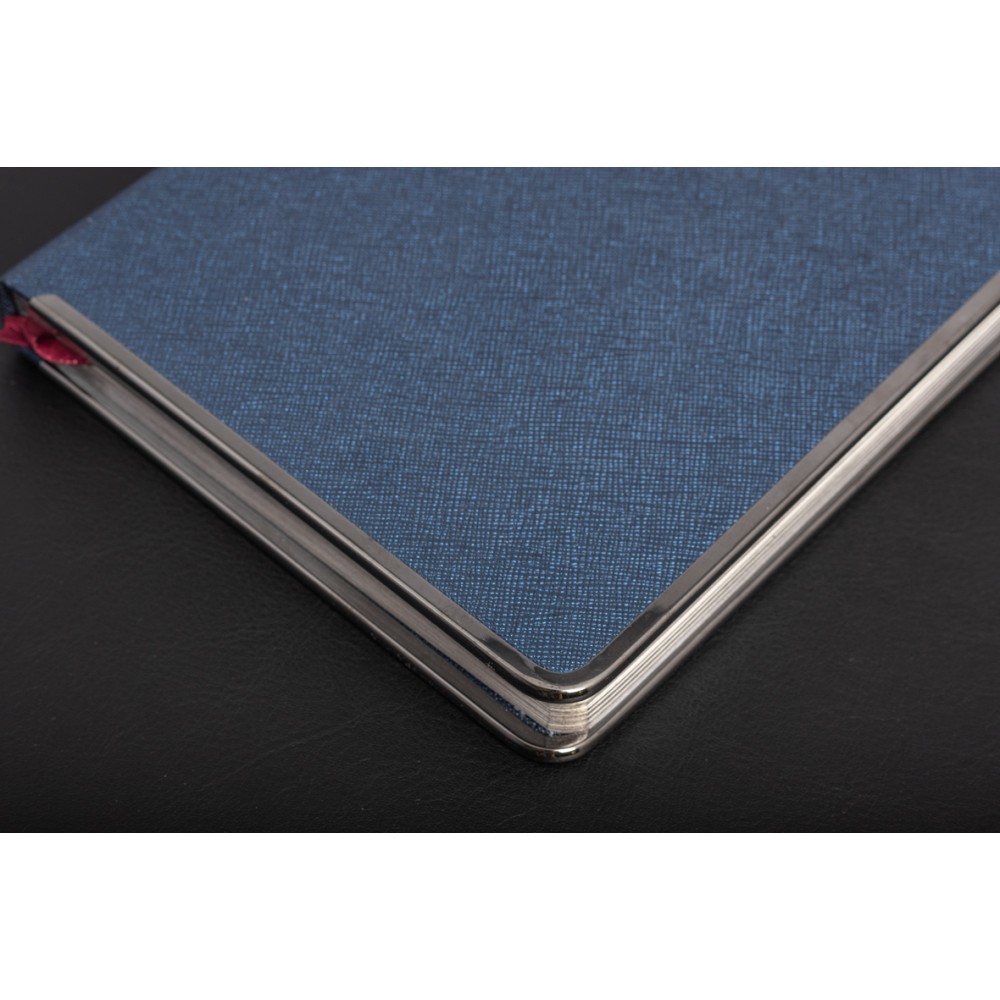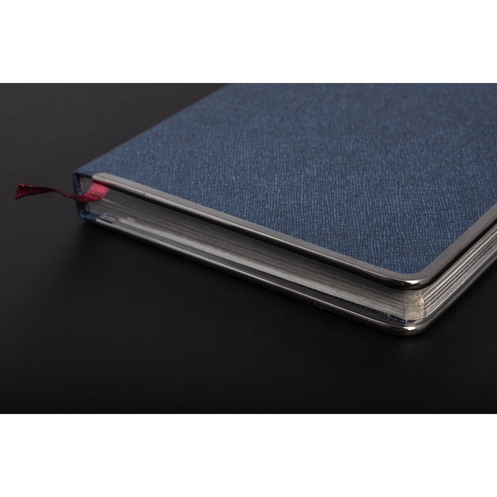 Синий ежедневник формата А5 доступен в твердом переплете. Эффектный рельеф обложки с благородным матовым эффектом напоминает натуральную кожу. Солидный и респектабельный образ создается с помощью металлической окантовки. Его блеск усиливается, чтобы соответствовать разрезу. Скругленные углы ежедневника подчеркивают изящество и элегантность. Недатированный блок состоит из 272 переплетенных страниц. Бежевая бумага снижает усталость от работы. Плотность листа 70г/кв. Обновлена справочная информация (единицы измерения, часовые пояса, номера телефонов и т. д.) на 19 страницах и добавлены тонкие шелковые закладки для более удобной навигации. Вы можете заказать тиснение на обложке этого дневника.