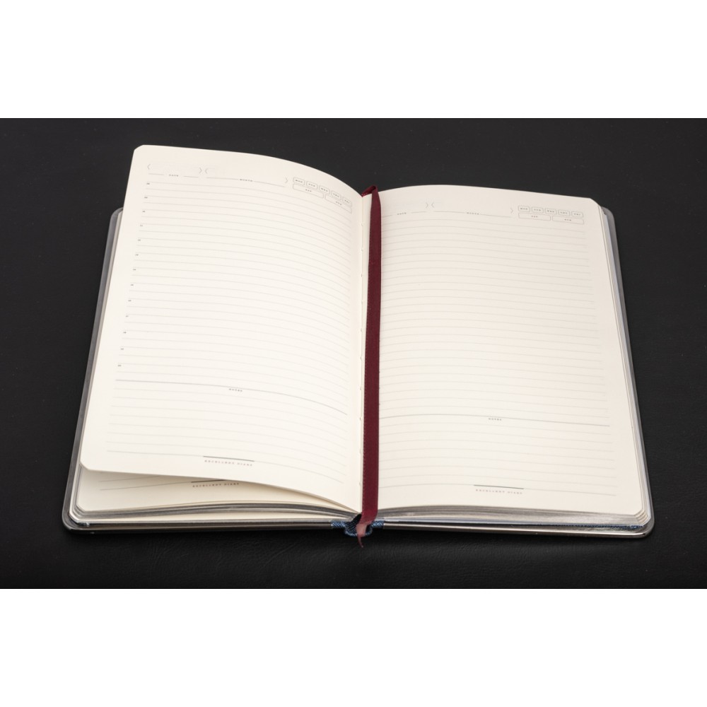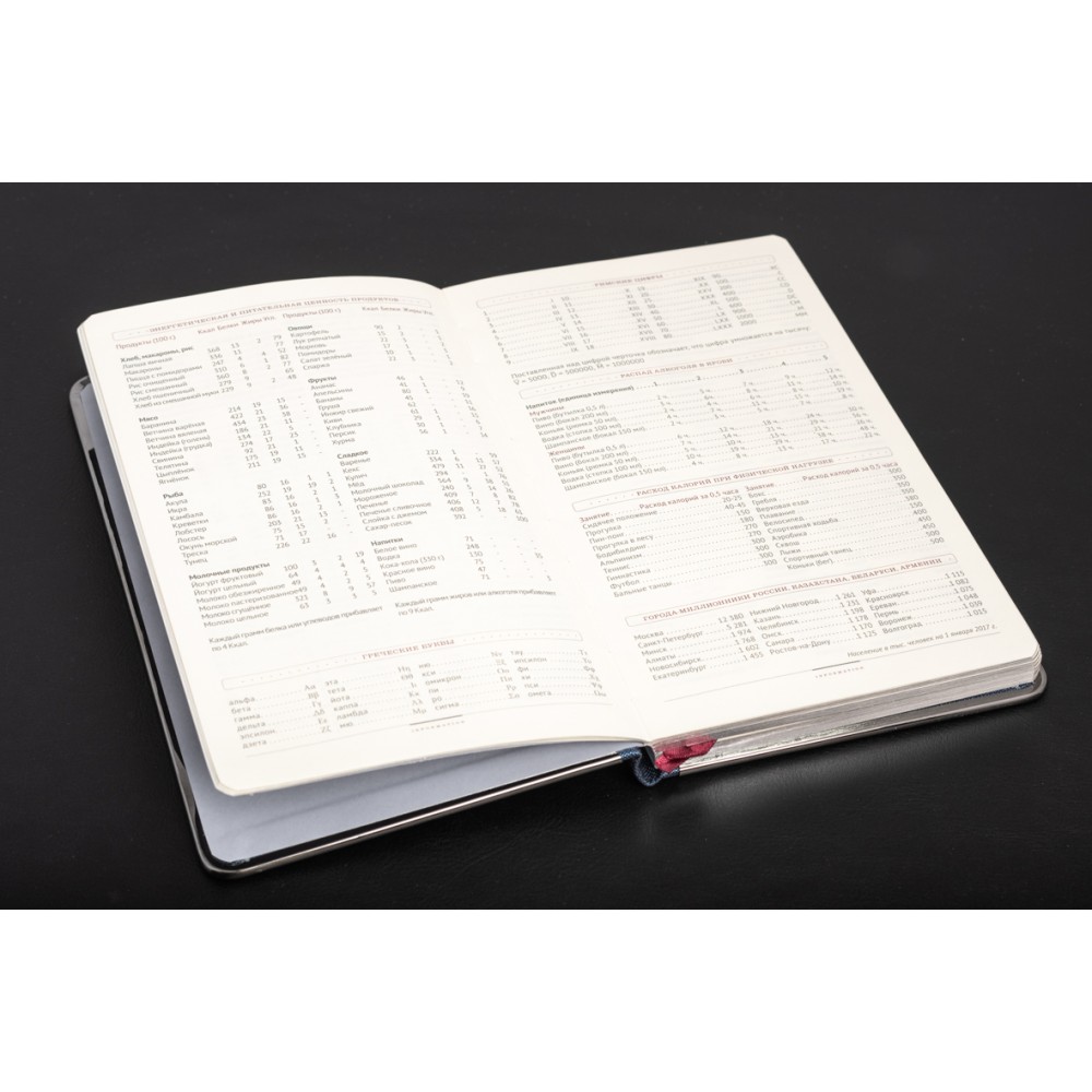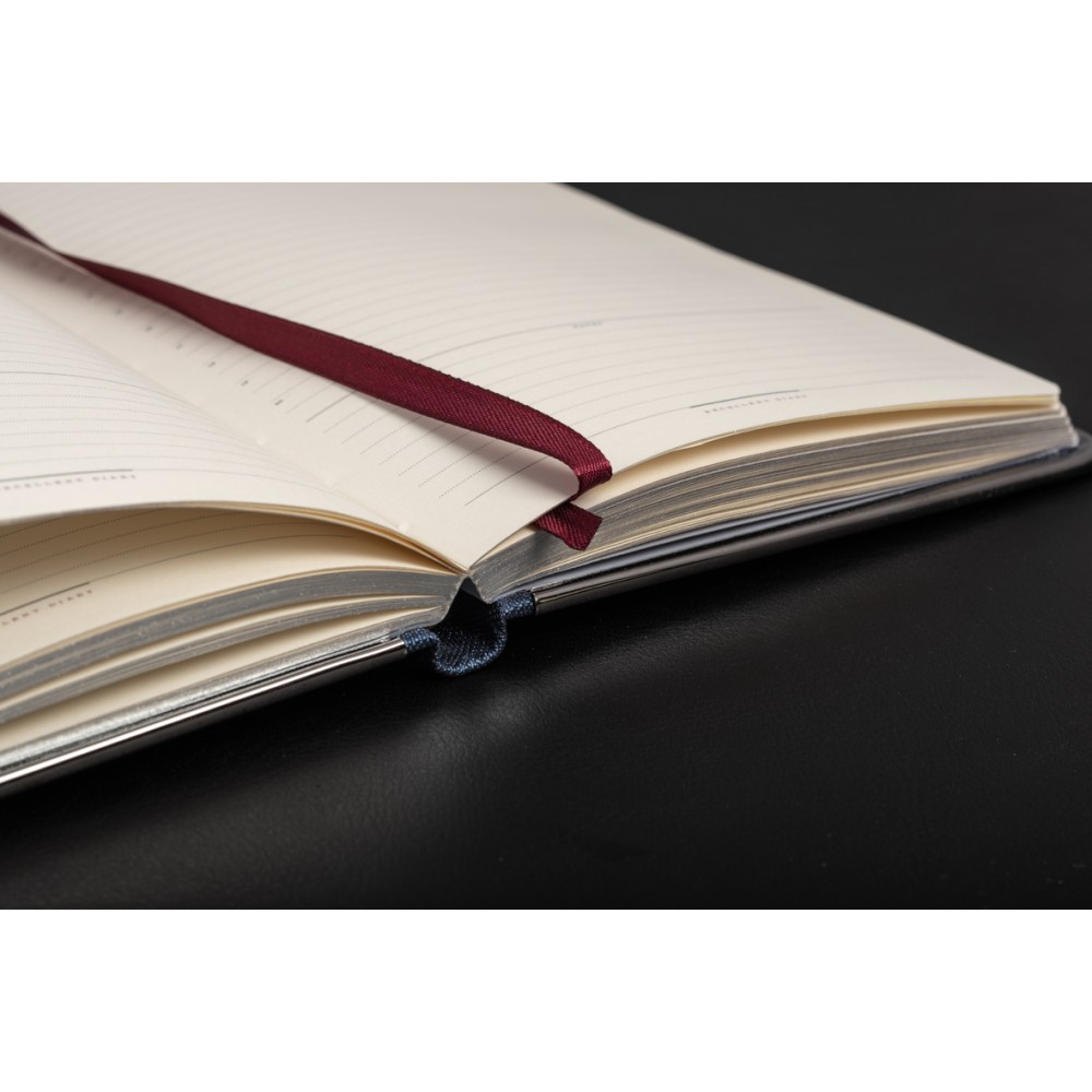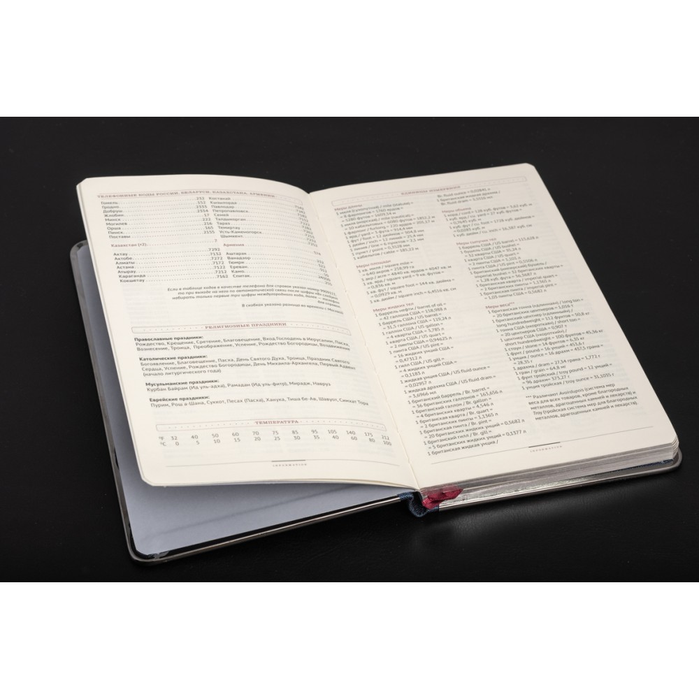 Синий ежедневник формата А5 доступен в твердом переплете. Эффектный рельеф обложки с благородным матовым эффектом напоминает натуральную кожу. Солидный и респектабельный образ создается с помощью металлической окантовки. Его блеск усиливается, чтобы соответствовать разрезу. Скругленные углы ежедневника подчеркивают изящество и элегантность. Недатированный блок состоит из 272 переплетенных страниц. Бежевая бумага снижает усталость от работы. Плотность листа 70г/кв. Обновлена справочная информация (единицы измерения, часовые пояса, номера телефонов и т. д.) на 19 страницах и добавлены тонкие шелковые закладки для более удобной навигации. Вы можете заказать тиснение на обложке этого дневника.